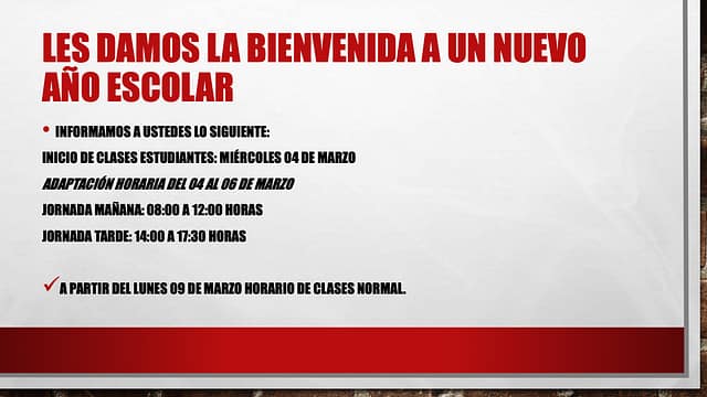 Estimada Comunidad junto con saludar ustedes y esperando que junto a sus hijos hayan tenido una reponedoras y merecidas vacaciones, les informamos lo siguiente y que corresponde al año inicio del presente escolar 2026: